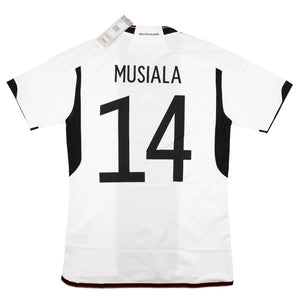 The Germany 2022-23 Home Shirt (Musiala #14) as worn by players such as Muller, Kimmich, Musiala, Goretzka, Sane and Havertz as the team finished 3rd in their group at the 2022 World Cup.
